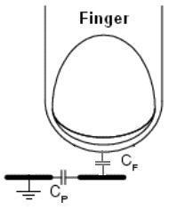 要感應(yīng)到手指的存在,電容式感應(yīng)系統(tǒng)首先要知道沒有手指時的傳感器電容(見圖2a),也稱為寄生電容(Cp)。當手指接近或接觸傳感器時(見圖2b),傳感器電容值將會變化,這就產(chǎn)生了和Cp并聯(lián)的另一個電容,稱為手指電容(Cf)。有手指存在時,總傳感器電容(Cx)如方程1所示: