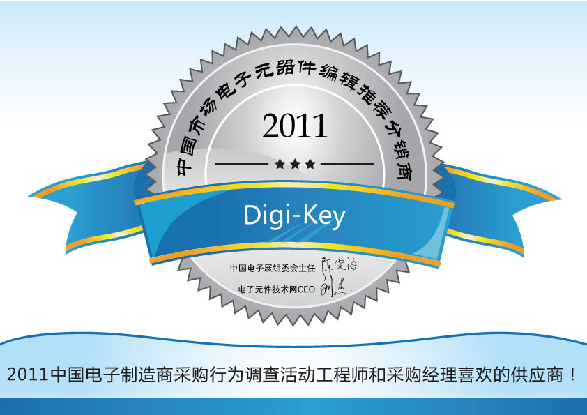 在近日剛剛結(jié)束的2011中國(guó)電子制造商采購(gòu)行為調(diào)查暨中國(guó)市場(chǎng)電子元器件領(lǐng)軍廠(chǎng)商的評(píng)選活動(dòng)中,Digi-key憑借廣泛的電子元器件庫(kù)存、最全面的在線(xiàn)資源和快速響應(yīng)客戶(hù)訂單等多方面優(yōu)勢(shì),以及在工程師心目中形成的良好形象,一舉榮獲2011中國(guó)市場(chǎng)電子元器件編輯推薦分銷(xiāo)商稱(chēng)號(hào)!