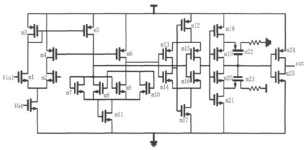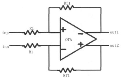 D 類音頻功率放大器的輸入放大級是基于運算放大器(OTA)的閉環(huán)結(jié)構(gòu)來實現(xiàn)的,其結(jié)構(gòu)如圖4所示,用來根據(jù)需要對輸入的音頻信號作電平調(diào)整和信號放大處理,使輸入信號在幅度方面能滿足后級電路的要求,輸入放大級的增益可以通過設(shè)置Rf1和R1 的阻值來決定。