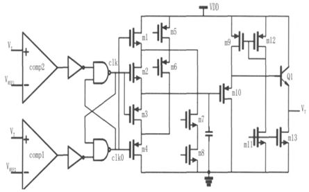 本文采用的三角波產(chǎn)生電路結(jié)構(gòu)如圖6 所示,其中m5、m6 和m7、m8 構(gòu)成了兩組恒流源,m9~m13 和Q1 構(gòu)成了輸出級。在電路中,采用將輸出信號VT 分別反饋到比較器comp1 和comp2,與參考電平VREF1 和VREF2(VREF2<VREF1)進行比較,并通過一組數(shù)字電路產(chǎn)生兩路反向的時鐘信號clk 與clk0,來控制m2 和m3 的開啟和關(guān)斷,從而達到對電容C 進行充放電,產(chǎn)生三角波信號VT 的目的。