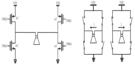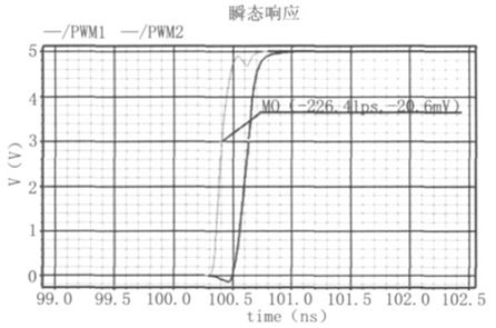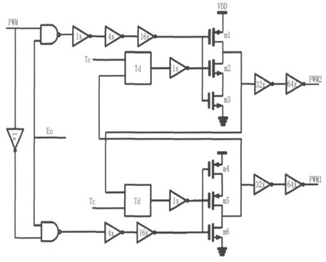 驅(qū)動電路結(jié)構(gòu)如圖8 所示,該電路能有效調(diào)節(jié)死區(qū)時間(N 型、P 型功率開關(guān)管同時關(guān)斷),防止單臂"shoot- through"現(xiàn)象,并有保護關(guān)斷功能。輸入信號為比較器輸出的PWM 脈沖信號,PWM1用來驅(qū)動N 型功率開關(guān)管,PWM2 用來驅(qū)動P 型功率開關(guān)管。為了避免全橋開關(guān)電路中的單臂"shoot- through"現(xiàn)象,當(dāng)PWM 信號從低電平變?yōu)楦唠娖綍r,PWM2 應(yīng)首先變?yōu)楦唠娖剑?關(guān)斷PMOS 功率開關(guān)管,隨后PWM1 再變?yōu)楦唠娖?,開啟NMOS 功率開關(guān)管,如圖9 所示;反之,當(dāng)PWM 信號從高變?yōu)榈蜁r,PWM1 先變?yōu)榈碗娖?,關(guān)斷NMOS 開關(guān)功率管,隨后PWM2 再變?yōu)榈碗娖?,開啟PMOS 開關(guān)功率管。實際電路中,可以根據(jù)需要通過控制延遲單元的控制位Tc 來調(diào)整死區(qū)時間的長短。為減小失真,必須減小死區(qū)時間,該驅(qū)動電路采用了逐級增加驅(qū)動能力的方式來驅(qū)動功率管,從而減小了必要的死區(qū)時間,保證了低失真度。