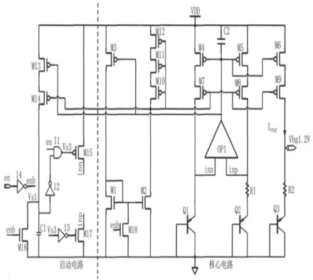 本文所設(shè)計的帶隙電壓基準(zhǔn)源結(jié)構(gòu)如圖10 所示,主要由核心電路與啟動電路兩部分組成。