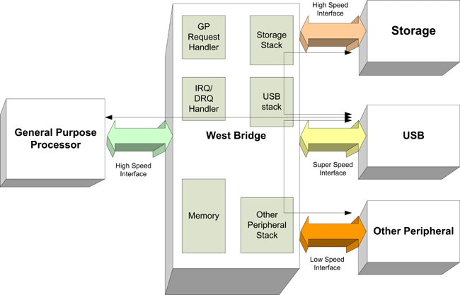 在一個(gè)普通的場(chǎng)景中,在device端,處理器直接連接到USB、存儲(chǔ)器和外設(shè)。記住這種結(jié)構(gòu),由High-Speed過(guò)渡到SuperSpeed,處理 器的影響可以概括如下: