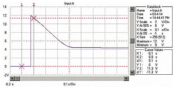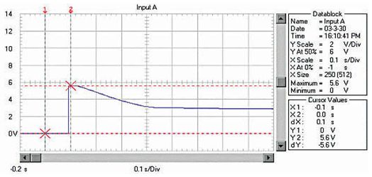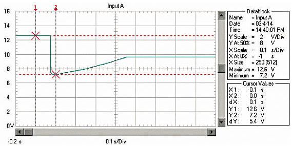 由于RM、RB、RL均非常低,啟動(dòng)電流非 常大。例如用12V、45Ah的蓄電池啟動(dòng)安裝1.9升柴油機(jī)的汽車,蓄電池的電壓在啟動(dòng)瞬間由12.6V降到約3.6V!啟動(dòng)過程的蓄電池電壓波形如圖 1;啟動(dòng)瞬時(shí)的電流達(dá)550A,約為蓄電池的12C的放電率!啟動(dòng)過程的蓄電池電流波形如圖2,(電流傳感器的電流/電壓變換比率:100A/V)。盡管 車用蓄電池是啟動(dòng)專用蓄電池,可以高倍率放電,但在圖1中可以看出,10倍以上的高倍率放電時(shí)的蓄電池性能變得很差,而且,如此高倍率放電對蓄電池的損傷 也是非常明顯的。啟動(dòng)過程的電壓劇烈變化也是極強(qiáng)的電磁干擾,可以造成電氣設(shè)備的“掉電”,迫使電氣設(shè)備在發(fā)電機(jī)啟動(dòng)過程結(jié)束后重新上電,計(jì)算機(jī)在這個(gè)過程中非常容易死機(jī)。因此,無論從改善汽車電氣設(shè)備的電磁環(huán)境還是改善汽車的啟動(dòng)性能和蓄電池的性能、延長使用壽命來考慮,改善汽車電源在啟動(dòng)過程的性能是必要的。