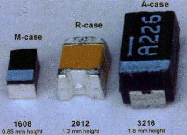 借助M.A.P.工藝,鉭電容的外殼尺寸一路從A下降到0805(目前的技術)到0603或者0402.鉭粉的改良可以把10?F~10V容量的0805外殼尺寸減少到0603的外殼尺寸,如圖 4 所示。