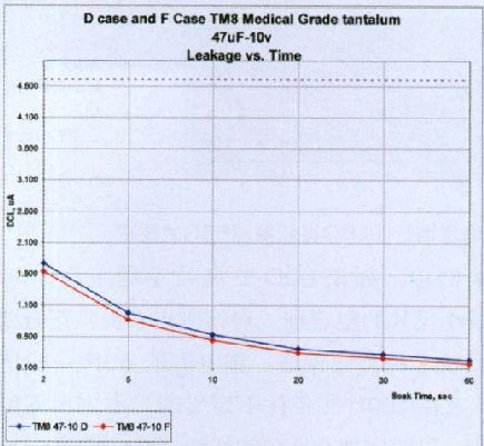 圖8是一種47uF-10V的鉭電容,雖然其最大DCL為4.7uA,根據(jù)特定的保壓時間篩選后,可為應用提供超低DCL.以圖8的元件為例,該批量可以按照10秒鐘DCL 600nA的標準篩選,從而把總體 DCL 從 4.7uA 降至 600nA 限值。