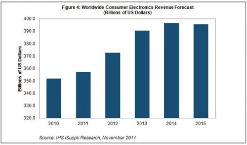 但不都是負(fù)面消息。雖然第二和第三季度的消費(fèi)電子營(yíng)業(yè)收入低于去年同期水平,但隨著電視與藍(lán)光播放器假日銷售高于2010年水平,上述趨勢(shì)將從第四季度開(kāi)始逆轉(zhuǎn)。IHS公司認(rèn)為,預(yù)計(jì)2012和2013年增長(zhǎng)率將超過(guò)4%,相比于當(dāng)前的低迷狀態(tài),屆時(shí)多數(shù)消費(fèi)電子領(lǐng)域?qū)?huì)恢復(fù)活力。