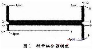 微帶定向耦合器在ADS中的模型如圖1所示。是一個四端口器件,中間是一段耦合線。四個端口分別連接于外部的50Ω端口。從5點(diǎn)到7點(diǎn)是高阻抗線,7端點(diǎn)接地,這個長度是一個變量。連接每個端口(3端口除外)的微帶線寬度是2.25mm,長度是14.4mm,3端口連接的微帶線寬度是1.4mm,長度是5mm。耦合線的長度是57.7mm,導(dǎo)帶寬度是2.1mm,導(dǎo)帶間距是O.45mm。本文主要討論高阻抗線的作用,所以先將高阻抗線長度置于零。PCB板采用PTFE材料,介電常數(shù)是2.5,厚度是0.5cm。