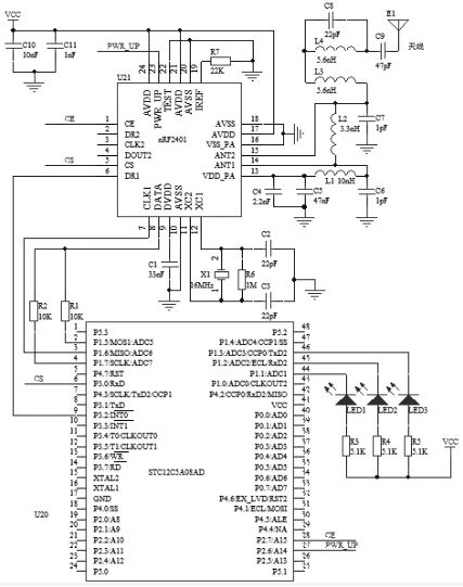 nRF2401 是一個(gè)單片無(wú)線收發(fā)一體芯片,工作在2.4GHz ISM 頻段,完全集成功率合成器、功率放大器、晶體振蕩器和調(diào)整電路。采用QFN24 5×5 毫米封裝,應(yīng)用電路使用外圍元件少(見(jiàn)圖2);采用FSK 調(diào)制方式,125 個(gè)頻道,能滿足多頻及跳頻需要;傳輸速率高達(dá)1Mbps,具有高數(shù)據(jù)吞吐量;功耗低,電源電壓1.9V~3.6V 滿足低功耗設(shè)計(jì)需要;芯片內(nèi)部設(shè)有專(zhuān)門(mén)穩(wěn)壓電路,使用各種電源包括DC/DC 開(kāi)關(guān)電源均有較好的通信效果。