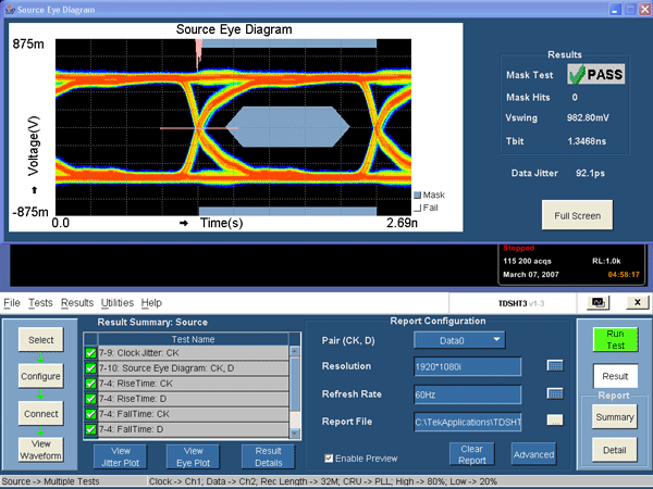 圖2是一次利用HDMI一致性測試軟件進(jìn)行HDMI V1.3源端測試得到的結(jié)果。同時,為保證全面體現(xiàn)信號特點,CTS 1.3b還規(guī)定了捕捉信號所需的最小示波器記錄長度。根據(jù)該規(guī)定,示波器至少應(yīng)能累積40萬個單位時間間隔(或Tbit)來繪制眼圖。在16 M/20 M的記錄長度下,示波器至少能捕捉40萬單位時間間隔的低分辨率信號,或260萬單位時間間隔的高分辨率信號??紤]到高達(dá)3.4Gbps的數(shù)據(jù)率,高采樣率(高于10GS/s)下示波器的最小記錄長度就應(yīng)大于16M。