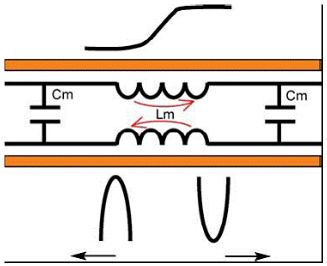 互阻抗沿著兩條走線呈均勻分布。串擾在數(shù)字門電路向串擾線打出上升沿時產生,并沿著走線進行傳播: