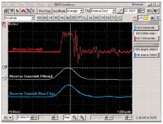 藍色波形是由白色波形濾波后減緩了脈沖上升沿得到的波形,它代表的就是對串擾進行后濾波的結果。圖中顯示的紅色和藍色兩個串擾波形是以相同的電壓刻度顯示的。