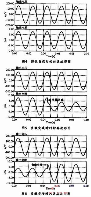 圖4給出了在輸入電壓為200V,額定負(fù)載分別為ZL=100Ω時(shí)的輸出電壓和輸出電流仿真波形;由圖4可見,輸出電壓頻率均能穩(wěn)定在50H z;圖5所示為負(fù)載突減時(shí)的仿真波形,其中突變部分是負(fù)載ZL=20Ω切換到ZL=40Ω時(shí)的輸出電壓、電流仿真波形;圖6為負(fù)載突增時(shí)的仿真波形,其中突變部分是負(fù)載ZL=40Ω切換到ZL=20Ω時(shí)的輸出電壓、電流仿真波形;通過以上仿真波形圖可知,該系統(tǒng)工作穩(wěn)定,靜態(tài)誤差小,并具有很強(qiáng)的魯棒型,同時(shí),這種電流內(nèi)環(huán)電壓外環(huán)的雙閉環(huán)控制的動(dòng)態(tài)響應(yīng)速度非???,因此可見,用該方法對該系統(tǒng)控制電路進(jìn)行設(shè)計(jì)是有效而可行的。