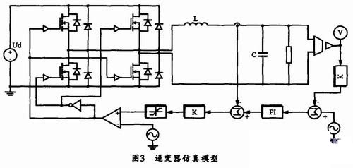 圖3所示是在PSIM下構(gòu)建的逆變器仿真模型。該模型主要有三部分:主電路、控制器和PWM脈沖生成模塊。其中控制器用于實(shí)現(xiàn)電壓電流雙環(huán)控制,為產(chǎn)生PWM脈沖提供調(diào)制信號(hào);PWM脈沖生成模塊采用雙極性調(diào)制方式。根據(jù)整個(gè)系統(tǒng)的閉環(huán)特征方程,并綜合考慮系統(tǒng)的控制要求,再通過選取阻尼比和自然角頻率,就可以得到系統(tǒng)控制器的參數(shù)??紤]到單相全橋逆變器系統(tǒng)控制的性能要求,在此基礎(chǔ)上所確定的最終系統(tǒng)仿真參數(shù)如下: