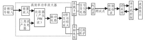 方案①:數(shù)字方案。輸入信號經(jīng)前置放大調(diào)理后,即由A/D采入單片機進行處理,三角波產(chǎn)生及與音頻信號的比較均由軟件部分完成,然后由單片機輸出兩路完全反向的PWM波給入后級功率放大部分,進行放大。此種方案硬件電路簡單,但會引入較大數(shù)字噪聲。