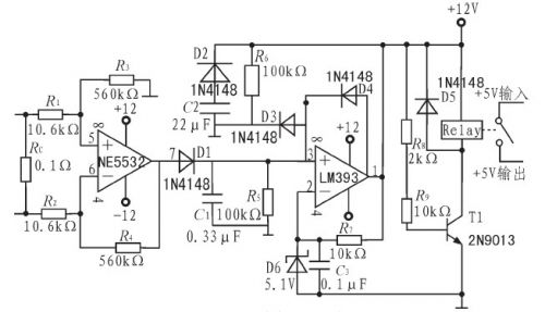 經(jīng)過放大后的信號經(jīng)過由D1、C1、R5組成的峰值檢波部分,檢出信號幅度值送至比較器與設(shè)定的基準(zhǔn)電壓進行比較。比較器選用低功耗、響應(yīng)速度較快的雙路比較芯片LM393.比較器負端用穩(wěn)壓管D6及C3、R7設(shè)置為5.1V,比較器接成遲滯比較方式,一旦過流,即可自鎖。此時比較器輸出的高電平使三極管T1導(dǎo)通,繼電器的地控制端與地聯(lián)通,繼電器吸合,切斷功放部分的供電,達到保護目的。因比較器自鎖,所以在解決過流問題后,關(guān)斷保護模塊的電源,才能重新進入保護狀態(tài)。D2、D3、R6、C2組成開機延時電路,在斷電后,C2通過D2快速放電,防止開始瞬間C2上的殘余電壓對3號腳影響,防止比較器在非正常狀態(tài)下進入自鎖狀態(tài),使保護模塊不能發(fā)揮正常作用。
