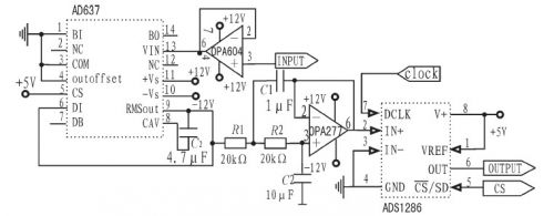 輸入綴用OPA604構(gòu)成一射極跟隨器已達到隔離前后級的作用。改變平均電容的值可設(shè)定平均時間常數(shù),并決定低頻準(zhǔn)確度、輸出波紋的大小和穩(wěn)定時間。交流波紋分量可以用增大此電容的值來減少,但這樣會使建立時間增大,所以選擇用后接一個二階有源低通濾波器的方法來減少輸出的紋波。得出真有效值后直接給入ADS1286進行模數(shù)轉(zhuǎn)換,再由FPGA處理,計算出系統(tǒng)的輸出功率并進行顯示。