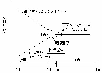 近場(near field)(磁和電的成份)和遠場的關(guān)系,如附圖一所示。所有的波都是磁場和電場成份的組合。這種組合稱作「Poynting向量」。實際上,是沒有一個單獨的電波或磁波存在的。我們之所以能夠測量到平面波,是因為對一個小天線而言,在距離來源端數(shù)個波長的地方,其波前(wavefront)看起來像平面一樣。