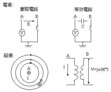 V是電壓,I是電流,R是電阻,Z是阻抗(R + jX),rf是指射頻能量。如果射頻電流存在于PCB走線中,且此走線具有一個固定的阻抗值,則一個射頻電壓將被產(chǎn)生,而且和射頻電流成正比。請注意,在電磁波模型中,R是被Z取代,Z是復(fù)數(shù)(complex number),它具有電阻(屬于實數(shù))和電抗(屬于虛數(shù))。