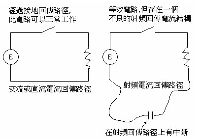 Maxwell方程式、Kirchhoff和Ampere定律全部都在說:若要使一個電路正常工作或依期望的目的工作,一個封閉回路型網(wǎng)絡(luò)必須要存在。附圖五表示了這樣的典型電路。當一條走線從來源端到達負載,一個回傳電流路徑也必須要存在,這是Kirchhoff和Ampere定律所規(guī)定的。