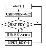 下面以IN端點(diǎn)2為例,說(shuō)明數(shù)據(jù)如何通過(guò)USB接口傳遞到電腦上。當(dāng)電腦發(fā)出IN請(qǐng)求時(shí),如果USB端點(diǎn)2的FIFO非空,就向電腦發(fā)送FIFO里的內(nèi)容;如果FIFO為空,則向電腦發(fā)送一個(gè)空包作為回應(yīng)。CC2531通過(guò)寄存器位USBCSIL.INPKT_RDY來(lái)控制電腦和8051 MCU內(nèi)核對(duì)USB的FIFO的使用權(quán)。當(dāng)INPKT_RDY=1時(shí),電腦正在對(duì)USB端口進(jìn)行訪問(wèn),8051 MCU內(nèi)核無(wú)法向FIFO內(nèi)寫(xiě)入數(shù)據(jù);當(dāng)INPKT_RDY=0時(shí),8051 MCU內(nèi)核可以將發(fā)送數(shù)據(jù)寫(xiě)入FIFO內(nèi),置位INPKT_RDY=1,完成數(shù)據(jù)的上傳。其流程如圖4所示。