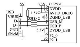 CC2531的USB硬件連接很簡(jiǎn)單,如圖3所示。采用USB總線供電方式,通過(guò)電壓轉(zhuǎn)換芯片AM11173.3為硬件電路提供3.3 V電壓(圖中未畫(huà)出)。由于該設(shè)備為全速設(shè)備,因此D+信號(hào)線通過(guò)電阻上拉。