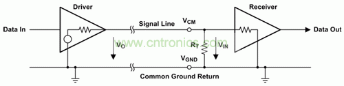 單端數(shù)據(jù)傳輸僅使用一條信號(hào)線,其電勢(shì)被看作接地。當(dāng)信號(hào)線為信號(hào)電流提供正向通道時(shí),接地線會(huì)提供回流通道。圖 1 顯示了單端傳輸通道的基本示意圖。