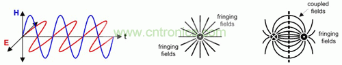 圖 3 從單導(dǎo)線周圍的大散射磁場(chǎng)和差動(dòng)信號(hào)線對(duì)緊耦合導(dǎo)線回路之外的小散射磁場(chǎng)輻射出的 TEM 波