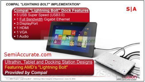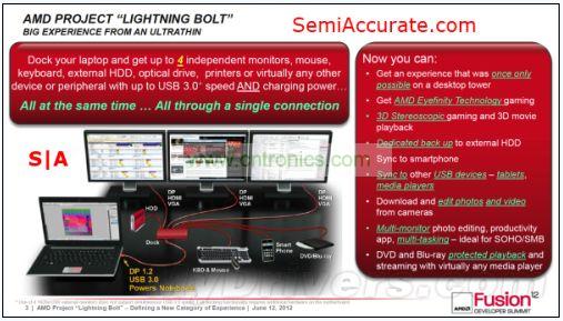 從硬件層面上看,Lightning Bolt其實(shí)很簡單,驅(qū)動級的硬件兼容性使得芯片上的USB通道及APU上的DP通道用一條線纜就可以連接起來并輸出到hub上。