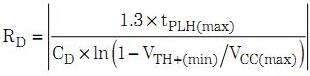 當(dāng)總線電壓變?yōu)檎╒Bus > 200 mV)時,RX1 輸出變?yōu)楦撸潋?qū)動 DR2 輸出為高,并通過 RD 對 CD 緩慢充電。必須正確計算最小時間常量(RD × CD),以使最大電源電壓 VCC(max) 和最小正反相器輸入閾值VTH+(min) 時,延遲時間tD 超過驅(qū)動器最大低到高傳播延遲 tPLH(max),即超出 30%。例如,電容為 CD = 100 Pf 時,RD 的要求電阻值為:
