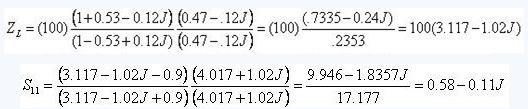 舉個例子,用100歐姆阻抗表征的復合回波損耗S11=0.53-0.12J轉(zhuǎn)換到90歐姆的如下: