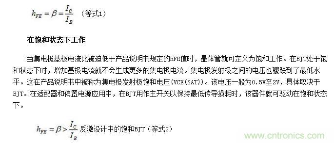 在基極發(fā)射極結(jié)點處于正向偏置,而集電極至發(fā)射極路徑為偏置時,這可打開洪流柵極,允許電流流動。連接至集電極的正偏置會吸引自由電子流向集電極端,在N材料中形成電子匱乏。這可吸引來自基極的電子,將其耗盡在N材料中?,F(xiàn)在電流就可流經(jīng)集電極和發(fā)射極的耗盡層,形成完整電路。集電極電流(IC)的數(shù)量可能會比基極電流(IB)多好幾個數(shù)量級。IC與IB之間的比值一般稱為晶體管的DC電流增益。在產(chǎn)品說明書中也可表達為Beta(β)或hFE。注意,在晶體管產(chǎn)品說明書中,該比值在特定條件下給出,可能會有明顯的變化。