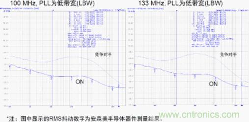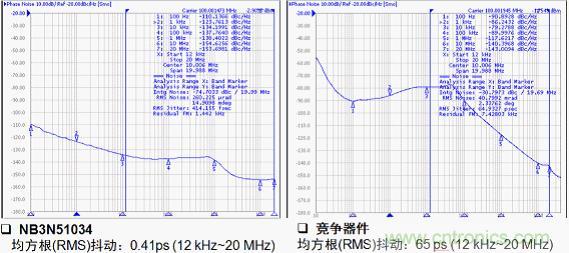 圖4:安森美半導(dǎo)體NB3N51034均方根抖動(dòng)性能明顯優(yōu)于競(jìng)爭(zhēng)器件