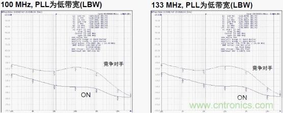 另外,多個(gè)PLL分層布置時(shí),用戶可調(diào)節(jié)帶寬對(duì)時(shí)鐘樹進(jìn)行系統(tǒng)優(yōu)化。使用HBW(高帶寬)擴(kuò)頻時(shí)鐘時(shí)用于維持?jǐn)U頻特性,從而將輸入與輸出相位差減至最小;使用LBW (低帶寬)可濾除PLL帶寬內(nèi)的時(shí)鐘輸入抖動(dòng)。