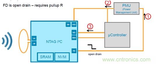 為了省電,整個系統(tǒng)可以通過FD 引腳檢測到有外部場強(qiáng)時喚醒主控,F(xiàn)D腳拉低喚醒: