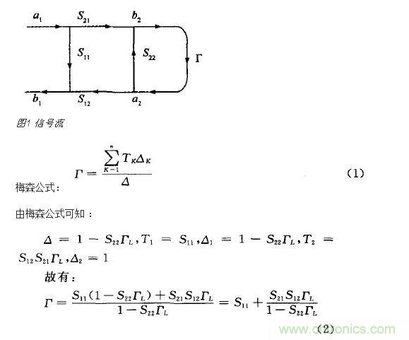 信號(hào)流圖(如圖1所示)結(jié)合散射參數(shù)是分析微波網(wǎng)絡(luò)和微波測(cè)量系統(tǒng)的簡(jiǎn)便有效方法。流圖公式亦稱梅森不接觸環(huán)法則(Mason’s non-touching loop rule),簡(jiǎn)稱梅森公式。根據(jù)梅森公式可以直接求出信號(hào)流圖中任意兩點(diǎn)之間的傳輸值。