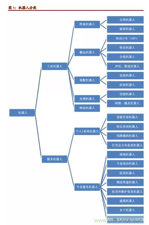 機器人專家從機器人應用環(huán)境出發(fā),將機器人分為兩大類,即工業(yè)機器人和服務機器人。工業(yè)機器人根據(jù)用途不同,大致可以分為焊接機器人、搬運機器人、噴漆機器人、涂膠機器人、裝配機器人、碼垛機器人、切割機器人、自動牽引車(AGV)機器人、凈室機器人等。而服務機器人則是除工業(yè)機器人之外的、用于非制造業(yè)并服務于人類的各種先進機器人,主要包括個人/家用服務機器人和專業(yè)服務機器人。其中,個人/家用機器人主要包括:家庭作業(yè)機器人、娛樂休閑機器人、殘障輔助機器人、住宅安全和監(jiān)視機器人等;專業(yè)服務機器人主要包括:場地機器人、專業(yè)清潔機器人、醫(yī)用機器人、物流用途機器人、檢查和維護保養(yǎng)機器人、建筑機器人、水下機器人,以及國防、營救和安全應用機器人等等。