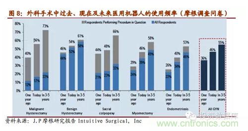 雖然當前醫(yī)用機器人普及率還很低,并且安裝的大部分是發(fā)達國家,但摩根的近期的一個調(diào)查研究中問及外科醫(yī)生們未來他們會在自己在手術中多高頻率的使用醫(yī)用機器人,數(shù)據(jù)表明美國的外科醫(yī)生們認為未來3-5年里醫(yī)用機器人在手術中的使用率會迅速上升到一個比較高的層次,約占50%,醫(yī)用機器人市場潛力巨大。IFR預測在未來的4年里,醫(yī)療機器會以每年19%的速度增長,2016年全球市場規(guī)模估計會增長到119億美元。