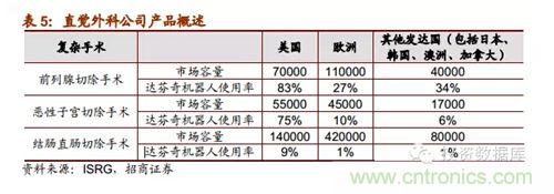 目前,直覺外科公司在復雜的外科手術中機器人應用技術嫻熟,美國的達芬奇機器人滲透率和使用率相對于其他地區(qū)和國家明顯更高,隨著更多國家對醫(yī)療機器的需求提高和直覺外科公司在國際市場的營銷推進,達芬奇機器人的市場潛力巨大。