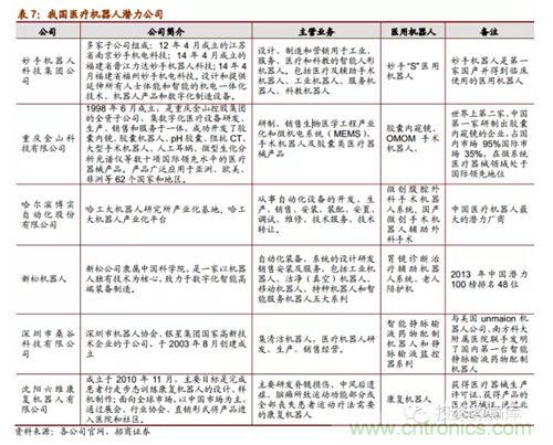 隨著醫(yī)用機器人技術的不斷突破和發(fā)展,從2005年開始我國有一批重點高校科研醫(yī)院單位及研究所在研究醫(yī)用機器人系統(tǒng)并取得了一些小成就,比如哈工大的微創(chuàng)腹腔外科手術機器已經(jīng)成功被專家驗收,天津大學的妙手機器人在今年3月份開始臨床使用;同時,隨著醫(yī)用機器人商業(yè)化市場化的可能性愈發(fā)明晰,已經(jīng)有部分企業(yè)正在生產(chǎn)或者打算進軍醫(yī)用機器人細分行業(yè),其中就包括機器人領先企業(yè)的博實股份和新松機器人。