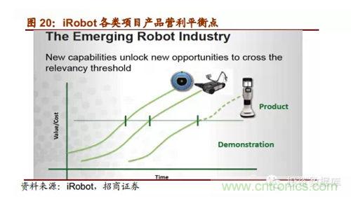 iRobot的產(chǎn)品戰(zhàn)略布局以家居清潔機器人為主。家居清潔機器人所需投入成本較其它產(chǎn)品低,最早成為現(xiàn)金牛,為新研發(fā)的更高級產(chǎn)品提供資金支持。目前遠程視頻機器人成功研制,開始進入營銷階段。