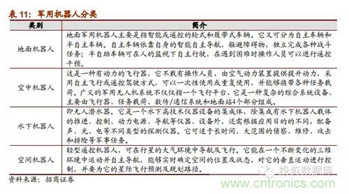 (五)軍事機器人是21世紀各國軍事安全重點戰(zhàn)略:蒂爾集團稱未來10年全球無人機研發(fā)投入和采購需求將達到940億美元。軍用機器人強國包括美德英法意以日韓,這些國家不僅在技術處于研究的先列,其產(chǎn)品已經(jīng)在軍事上有了實際運用;我國與這些強國的技術差距明顯,受政策支持,軍事機器人相關企業(yè)發(fā)展前景明顯良好,可能成為企業(yè)未來強勁的收入保證。