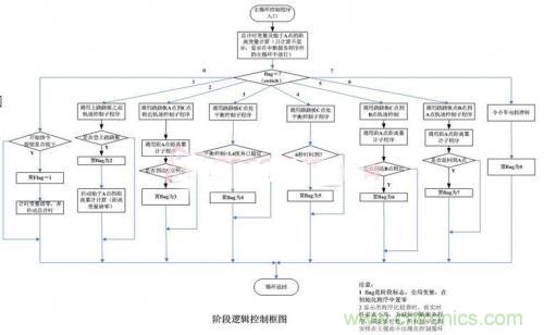 系統(tǒng)框圖如圖3所示,主控循環(huán)程序每隔一個采樣周期從FPGA接口中讀取各個傳感器的數(shù)值,并經(jīng)過處理后獲得小車的運行狀態(tài),根據(jù)小車的當(dāng)前狀態(tài)采取相應(yīng)的控制算法計算出電機(jī)所需的控制電壓值,進(jìn)而,該控制電壓值經(jīng)過PMW處理后輸出到小車驅(qū)動電機(jī),使小車按照希望的規(guī)律運動。為了使程序流程清晰簡潔,框圖中以一個標(biāo)志信號來記錄小車所運行的階段,控制器則根據(jù)小車所處的運行階段進(jìn)行相應(yīng)的控制。