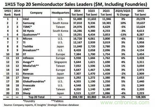 IC Insights的2015上半年全球前二十大半導體供貨商排行榜(包含晶圓代工業(yè)者)