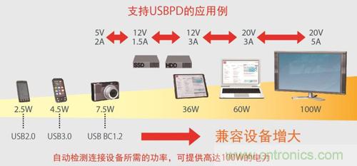在這方面ROHM公司先行一步,近日ROHM公司宣布,推出支持在USB Type-C接口中實現(xiàn)USB Power Delivery(以下稱USBPD)功能的供受電控制器IC——BM92TxxMWV系列,該器件可實現(xiàn)高達100W(20V / 5A)的供受電,而以往的USB Type-C接口的供受電能力僅為7.5W。BM92TxxMWV系列IC的推出,使得筆記本電腦和TV等需要較大功率的設備,也可通過USB端子供電來驅動;同時,在智能手機和平板電腦等USB端子的傳統(tǒng)用途中,還可實現(xiàn)比以往高約4倍以上的快速充電。