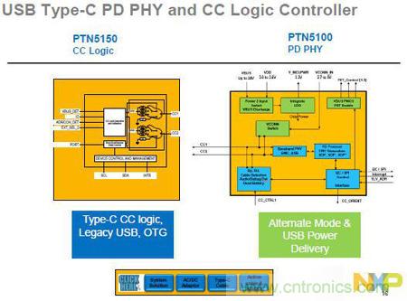 不同的應(yīng)用場(chǎng)景,不同的復(fù)雜度層次,NXP有不同的產(chǎn)品和方案來(lái)搭配,為設(shè)計(jì)者提供達(dá)到系統(tǒng)最佳化的方案。下圖中展示了NXP的CC邏輯控制和PD PHY方案。吳韶阡介紹說(shuō),如果是低于15W的供電,或者是不需要支持多功能的設(shè)計(jì),可以采用簡(jiǎn)單的CC邏輯控制;而一個(gè)完整的USB Type-C方案就需要使用完整的PD方案,相應(yīng)的元器件也會(huì)增加。