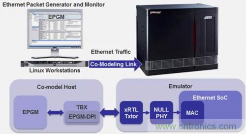 在此場景中,以太網(wǎng)測試儀模型運行于連接到硬件仿真器的Linux工作站上?;诔墒斓膶崿F(xiàn) IP,模型準確再現(xiàn)了實際的物理測試儀。這種虛擬測試儀包括以太網(wǎng)數(shù)據(jù)包生成器和監(jiān)視器 (EPGM),可以為 1G、10G、40G/100G 和 120G 網(wǎng)絡分別配置 GMII、XGMII、XLGMII/CGMII 和 CXGMII 接口。每個支持的MII端口都需要一個 xRTL 事務處理器(圖 2)。
