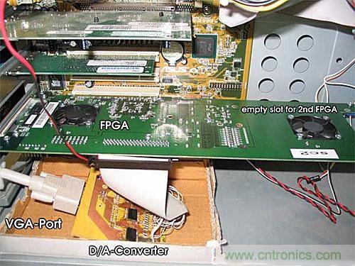 SaarCOR在SIGGRAPH 2005展示的RPU原型機用FPGA來構(gòu)建,頻率運行在66MHz,內(nèi)存帶寬也只有350MB/s,但是得益于特別設(shè)計的專用架構(gòu),其性能可以跟P4 2.6G的CPU跑OpenRT軟件光線追蹤的性能相媲美。