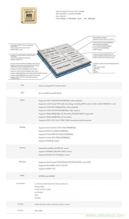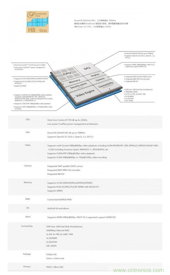 多媒體方面, H8支持多格式1080p@60fps視頻編解碼, 支持H.265/HEVC視頻處理,集成8M ISP圖像信號處理架構(gòu),可支持800萬像素攝像頭。 顯示方面,H8支持HDMI 1080p@60fps顯示,支持HDCP V1.2協(xié)議,支持HDMI CEC。此外,H8集成了全志新一代麗色顯示技術(shù),圖像顯示質(zhì)量進(jìn)一步提升。事實(shí)上,H8芯片最早是應(yīng)用于電視盒子。