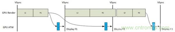 Oculus在博客里對ATW做了詳細(xì)的解釋。如上圖所示,GPU給左右眼的畫面分別進(jìn)行渲染,然后在畫面顯示出來之前插入一個ATW的處理過程。在左邊這幀的處理中,畫面渲染及時完成,此時直接顯示就行了;中間的第二幀渲染未能及時完成,此時如果什么都不做就會出現(xiàn)畫面抖動,而有了ATW的話,它會將前面一幀調(diào)用出來重新顯示,同時加上頭盔運(yùn)動變化,從而保持幀率。